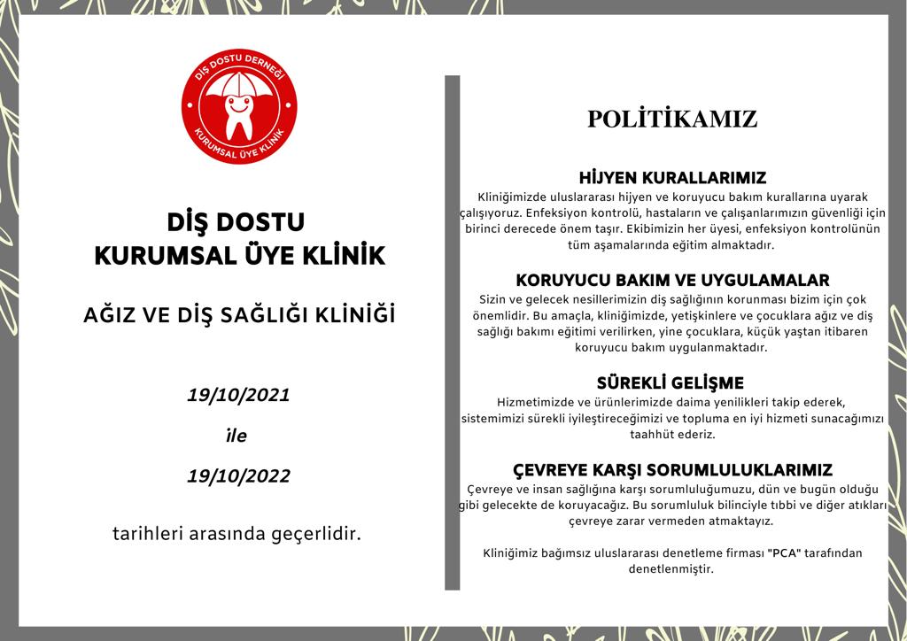 Klinik Lideri ve ekibi “Diş Dostu Kurumsal Üye Klinik” programına katılarak, uluslararası otoritelerce ve Türk Dişhekimleri Birliği (TDB) ve Sağlık Bakanlığı tarafından kabul edilen minimum hijyen ve sterilizasyon koşullarına uyacağını, diş çürüklerinin önlenmesi için koruyucu önlemleri alacağını ve her hastasını diş sağlığının korunması için bilgilendireceğini ve Diş Dostu Derneği’nin özel olarak oluşturulan bilgi paylaşım ağına dahil olacağını yazılı ve sözlü olarak beyan eder.